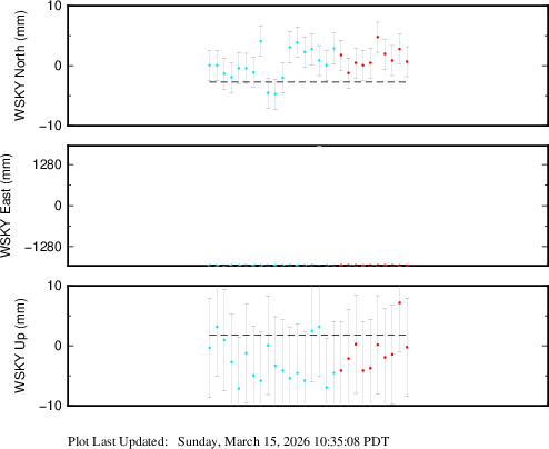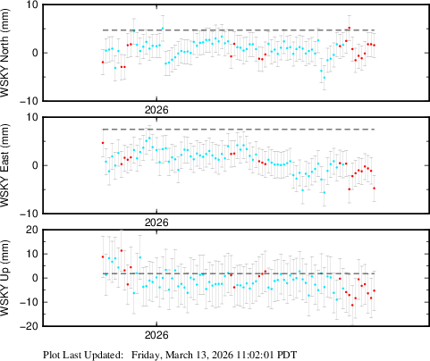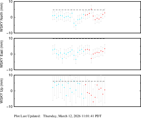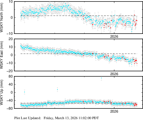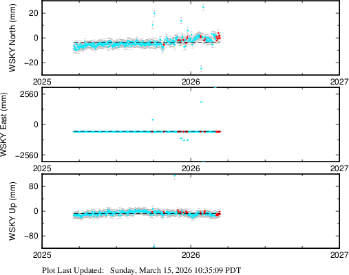 These results are preliminary. The station positions are unchecked and should not be used for any engineering applications. There may be errors in the antenna heights. The velocities are very dependent on the length of the span of observations. The presence of outliers (errant observations) sometimes contaminates the velocities.