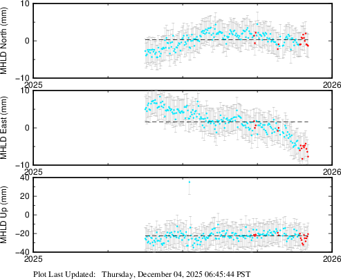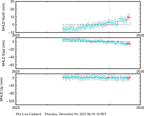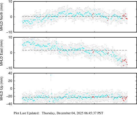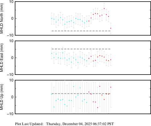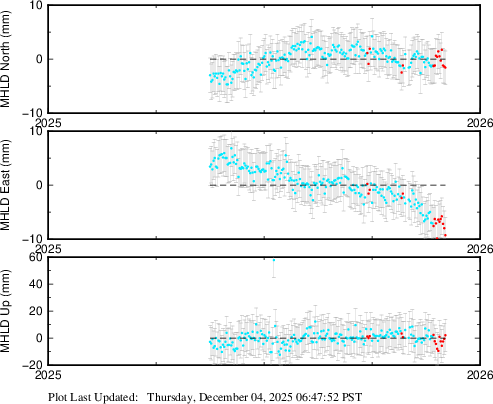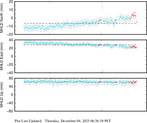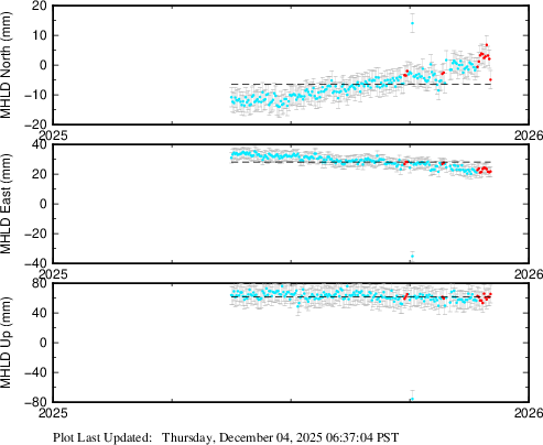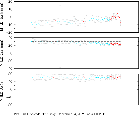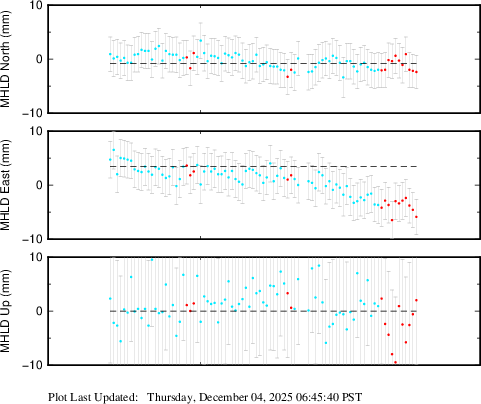 These results are preliminary. The station positions are unchecked and should not be used for any engineering applications. There may be errors in the antenna heights. The velocities are very dependent on the length of the span of observations. The presence of outliers (errant observations) sometimes contaminates the velocities.