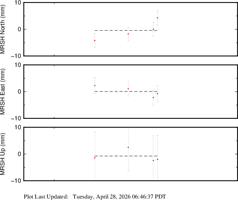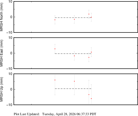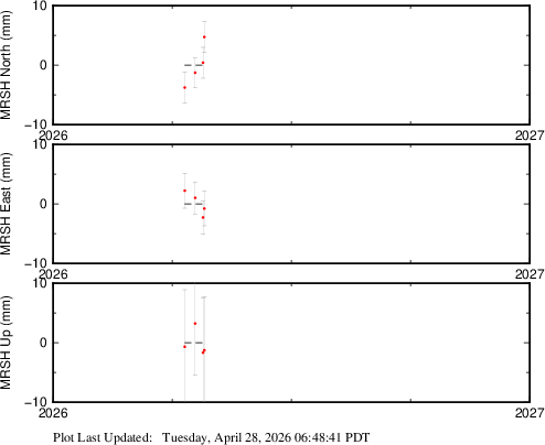 These results are preliminary. The station positions are unchecked and should not be used for any engineering applications. There may be errors in the antenna heights. The velocities are very dependent on the length of the span of observations. The presence of outliers (errant observations) sometimes contaminates the velocities.